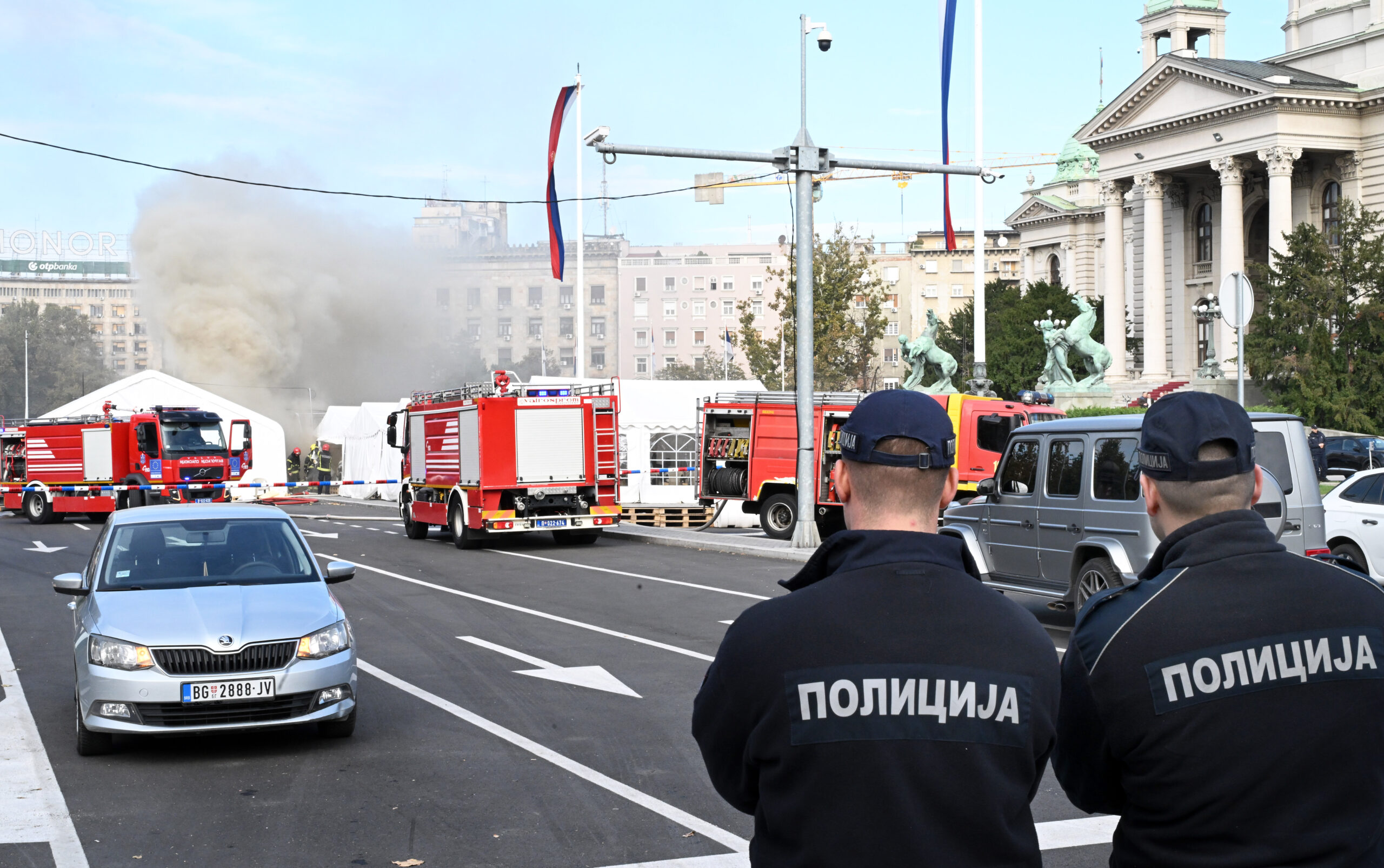 U kampu ispred doma Narodne skupštine poznatom kao „Ćacilend“ danas nešto posle 10 časova izbio je požar – podmetnuo ga je Vladan Anđelković. Anđelković je pucao i tom prilikom ranio Milana Bogdanovića.